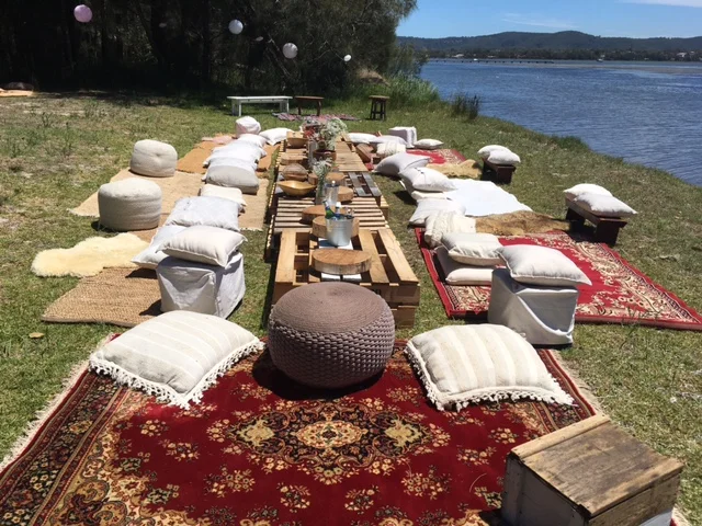 Beautiful Anne decided to have a relaxed evening at home with close friends to celebrate her birthday. This lovely flat backyard at Chittaway Bay was the perfect spot to create a Boho sitting area. After setting up a few Bright Boho parties recently, we were excited to stick to neutrals for this one. Really happy with how fresh and pretty this setting turned out. We loved being able to use our rattan screen divider along with our Mama, Papa and Baby Bear rustic lanterns which looked so pretty at night. Lots of comfy cushions and low seating, pallets, floor rugs, sea grass mats, lace, candles, fairy lights, flowers, bunting and table runners all came together beautifully. Anne was so over the moon with how pretty it looked and her guests absolutely loved the ambience!